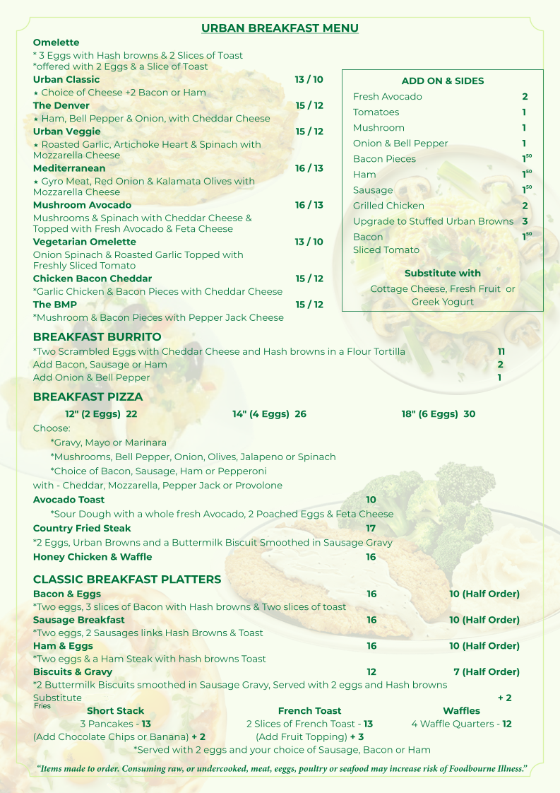 12" (2 Eggs) Choose: Gravy, Mayo or Marinara; Mushrooms, Bell Pepper, Onion, Olives, Jalapeno or Spinach; Choice of Bacon, Sausage, Ham or Pepperoni with - Cheddar, Mozzarella, Pepper Jack or Provolone